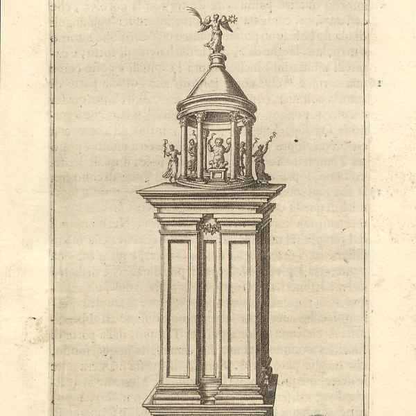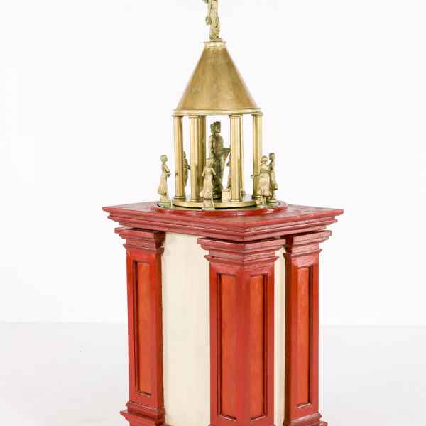 The mechanism that drives the initial movement of the small theater, which was intended to feature the Dionysian rite, is concealed in a cabinet-shaped structure mounted on a wheeled base. Before the beginning of the show, the theater travels along a straight line, moved by a counterweight placed in a container filled with millet. Once the bottom is opened, the millet comes out little by little as in a sand-glass: the counterweight lowers and drags the winch, which sets the wheels in motion. At this point, the little theater begins to come alive with the representation of the rite: a sacrifice is followed by celebration scenes and noises. Once the show is over, the theater returns to its initial position.
