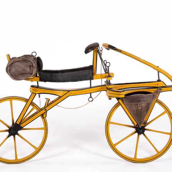 The bicycle was invented in 1817, when Baron Karl von Drais (1785-1851) designed the vehicle called “dandy horse” and also “draisienne” after him. This exhibit is a replica of the specimen on display in the Deutsches Museum in Munich, a Laufmaschine (“running machine”) built by Drais in Mannheim in 1817. Gripped with both hands, the handlebar serves to change direction and maintain balance. On either side of the front wheel is the double stand. The brake, which works on the rear wheel, is controlled by hand by a rope. Behind the saddle, a leather bag similar to the horse saddle bags contains a rain cape, while two bags for objects are anchored at the sides of the front fork.