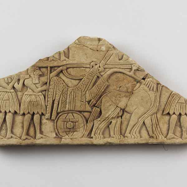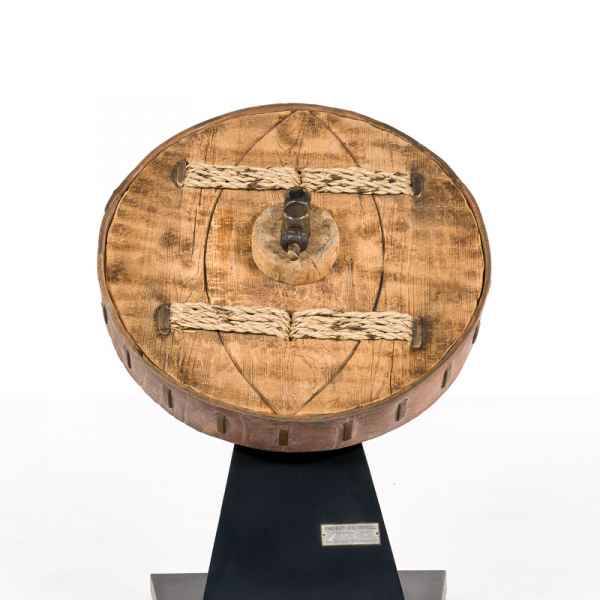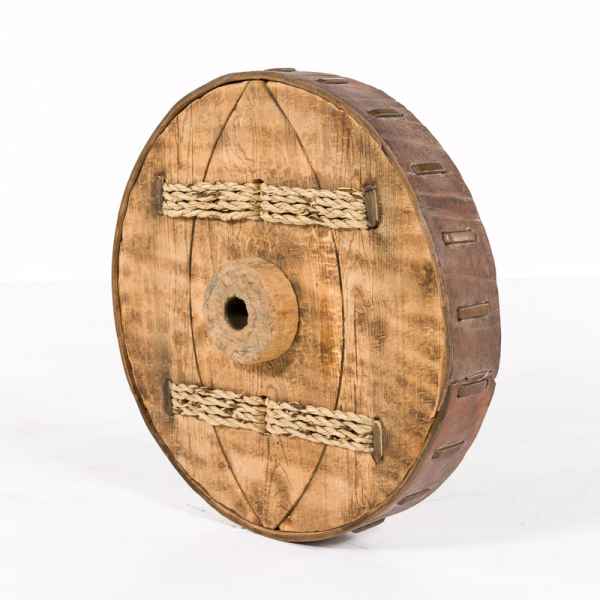 Il modello, che trae ispirazione dalle fonti documentarie in nostro possesso, in primis il bassorilievo del Penn Museum proveniente da Ur, mostra una ruota già perfezionata rispetto ai primi esemplari. La costruzione in tre parti permetteva di ottenere dimensioni accettabili (70 cm circa). Il tronco era tagliato in senso longitudinale, i tre elementi venivano tenuti assieme da colla animale e corde. Un ulteriore bloccaggio era garantito da incastri secondo la tecnica a “mortasa e tenone”, utilizzata anche per le imbarcazioni. Il perno è in bronzo, la cerchiatura in pelle di bue conciata per evitarne la decomposizione.