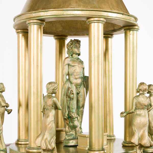 All’interno di una struttura a forma di mobiletto montata su una base munita di ruote è nascosto il meccanismo che governa il movimento iniziale del teatrino, destinato a presentare il rito dionisiaco. Prima che abbia inizio lo spettacolo, il teatrino percorre un tratto rettilineo, mosso da un contrappeso situato all’interno di un contenitore riempito di miglio. Una volta liberata l’apertura in basso, il miglio fuoriesce in modo regolare come in una clessidra: il contrappeso si abbassa e trascina l’argano, il quale mette in movimento le ruote. A questo punto il teatrino inizia ad animarsi con la rappresentazione del rito: a un sacrificio seguono scene e rumori di festa. Alla fine, il teatrino torna alla posizione iniziale.